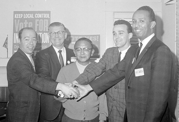 Members of the first Carson City Council pose together on Feb. 6, 1968. L to R: H. Rick Clark, John A. Marbut (mayor), Sak Yamamoto, John L. Junk, Gilbert D. Smith. (Daily Breeze staff file photo by Jack Wyman)
